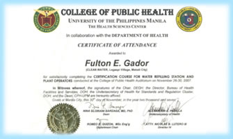"Mr. Fulton E. Gador, the owner, took a 40 hour Certification Course for Water Refilling Station and Plant Operators last November 2007 from the College of Public Health, University of the Philippines Manila which is a requirement of the Department of Health before any person could engage in a water refilling station business". |